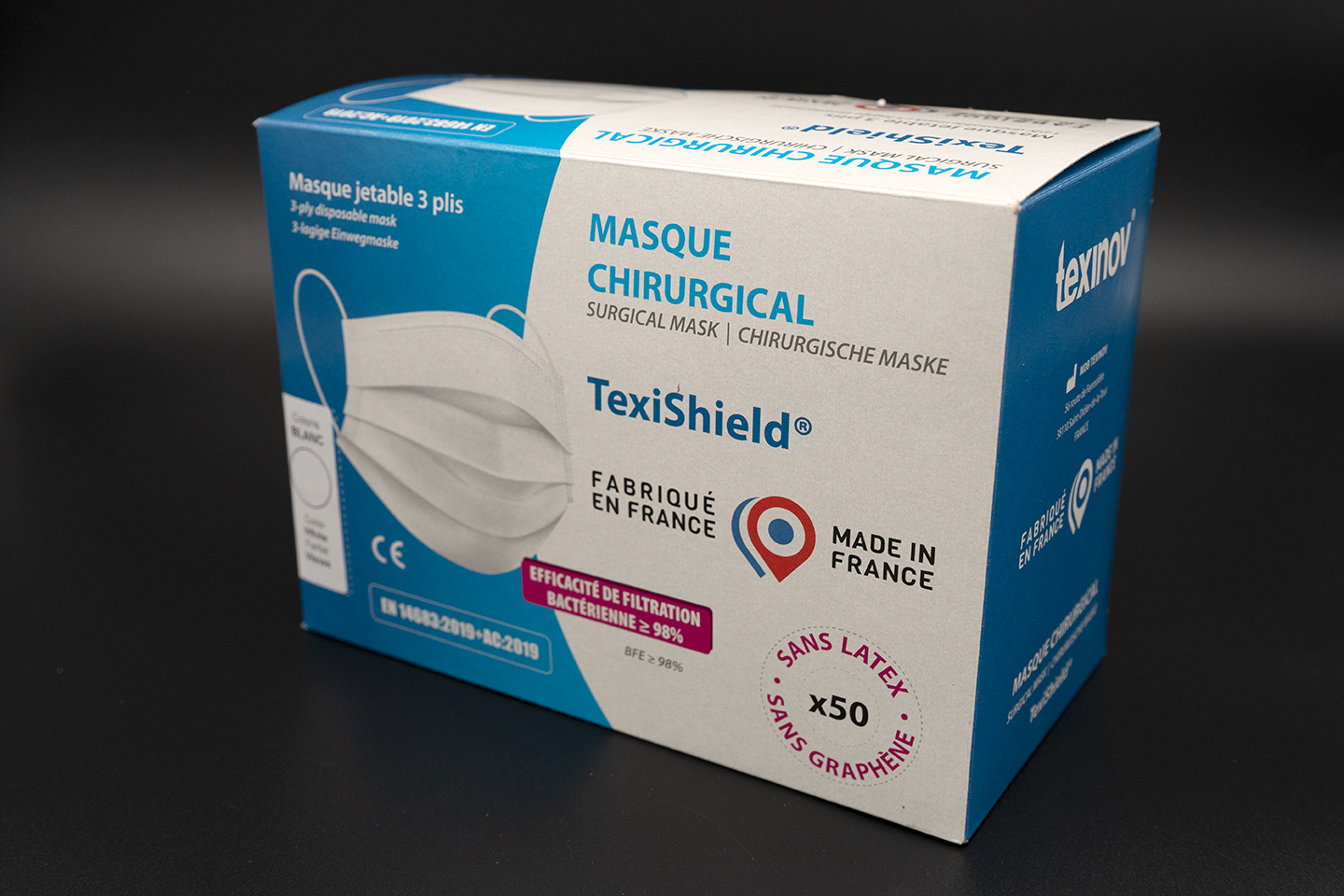 Le masque chirurgical TexiShield® limite la propagation de gouttelettes contaminées à l’entourage proche du porteur et protège celui qui le porte contre les agents infectieux transmissibles par voie « gouttelettes » (toux, éternuement, postillons…).